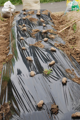 | 芽が出るのは恐らく5月中旬。それまで風でマルチの位置がずれないように土をかけておいた。 あとは芽が出てきたら支柱を立てることになる。 昨年は最初立てた支柱が台風が近づいた時倒れた。今年は同じ轍は踏まないつもりだ。 |