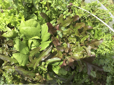 | こちらはレタス系が中心の小さな畝。 雑草も加わり、ほとんどジャングル状態だ。 |