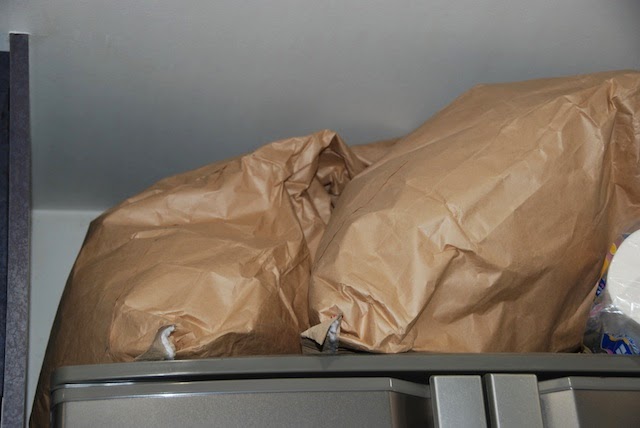 | ここは冷蔵庫の上。ふたつの米袋にかなりの数の種芋候補が入っている。 |