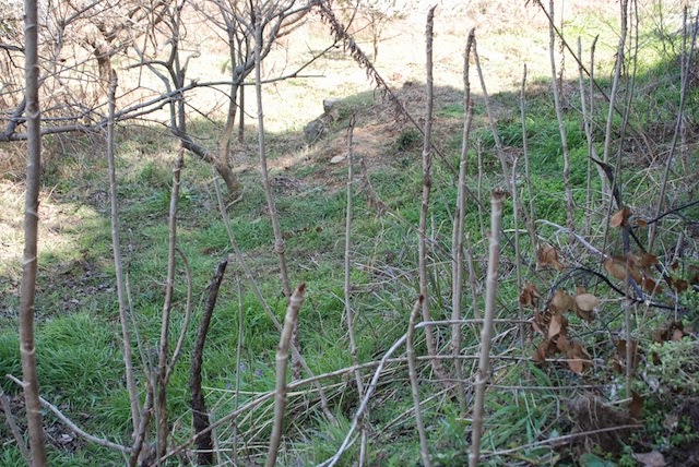そして、このシャガを植えた場所のすぐ下には、昨年多くの枝を挿して増やしたダラの木が元々ある太い枝に混じっていっぱい林立している。