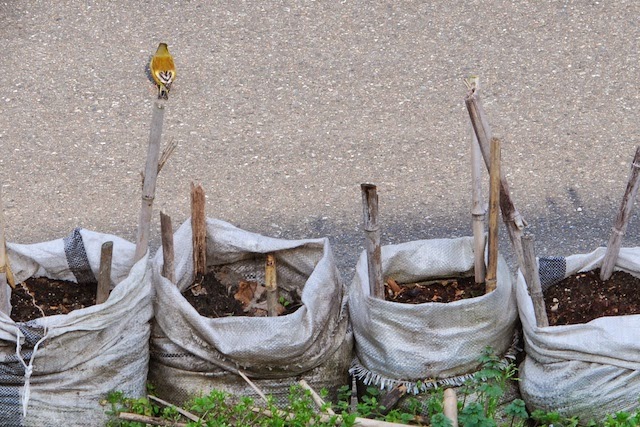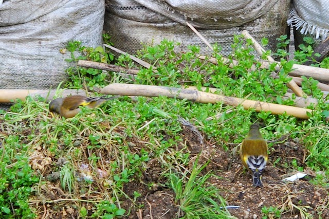 ゆっくり私の畑を楽しむことも出来ず追い出されたカワラヒワは、まず近くの道路に逃げだし、それからどこかに飛んで行った。