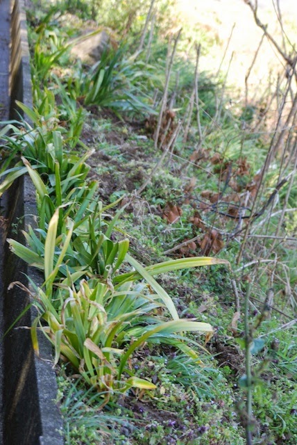 | シャガを植えている場所の左手は溝を挟んで道路がある。 右手にはダラの木がいっぱいだ。 |