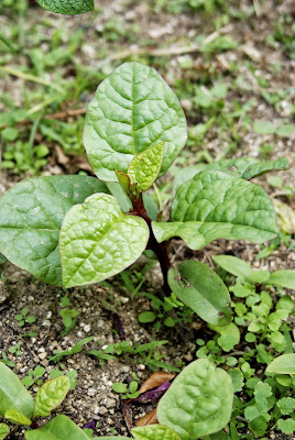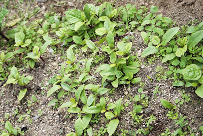 | 時期を間違えて出てきたツルムラサキ。 このまま雑草と一緒に引き抜いてしまうのはのはかわいそう? |