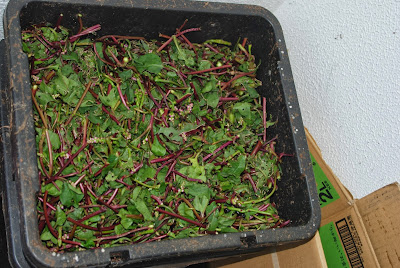 | Box3段重ねを使って、大量のツルムラサキによるミミズ君の餌実験。 先日ちょっと覗いて見たが、ミミズ君への評判はよさそうだった |