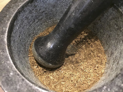 | ディルの種の皮は残っているが、茶色の細かな粉がいっぱい出ている。 やはり潰した方が、同じ量を使っても香りが強くなる印象だ。 |