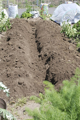 | こちらは第2菜園の畝。 3月末に種芋を植えた時の写真だ。 |
