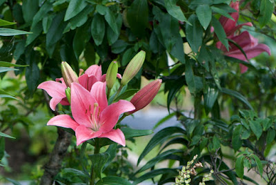 | 花壇では、ユリが大きな花を次々に咲かせている。 |