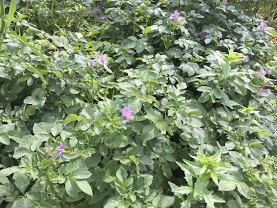 | この畝では、ほとんどの苗が収穫適期になっていた。 ただ、同じ畝でも、まだ花が咲いている苗もある。 芽出しが悪かったところに種芋を追加植えしたのかもしれない。 |