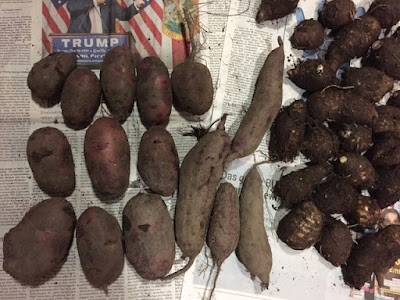 ジャガイモや、サツマイモは乾かさないで保存すると腐れ易い。 里芋についても土がついたまま乾かして保存するのがいいと聞いた。 で、これらの芋は皆収穫後一晩乾かしている。 |