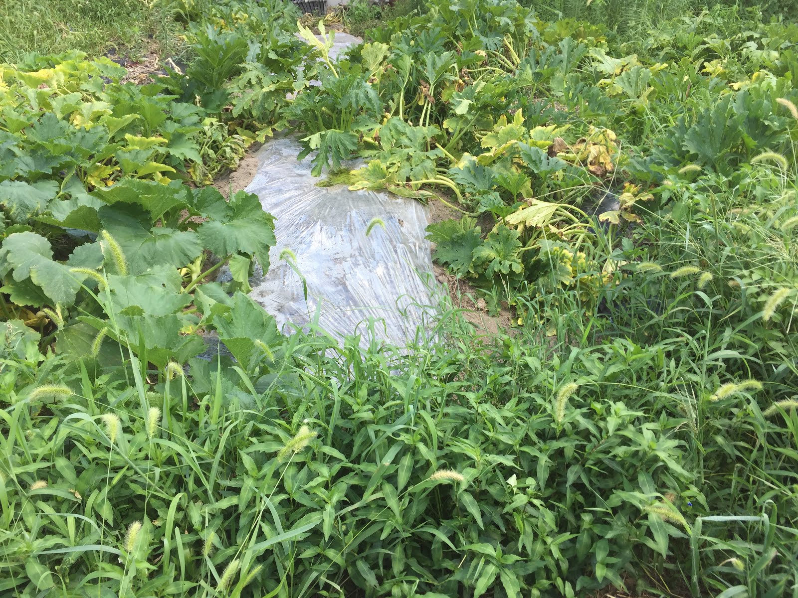 雑草の向こうの中央に見えるのが太陽熱マルチの畝だ。 今日のような灼熱の太陽の下ではさぞかし温度が上がっていると思われる。 両側の畝に植えていたズッキーニからは畝から遠いところまで枝が伸びていた。 |