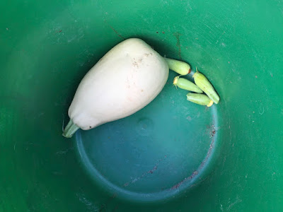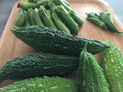 この赤ちゃんズッキーニがいかに小さいかは、今日収穫した、ゴーヤなどと比べると分かる。