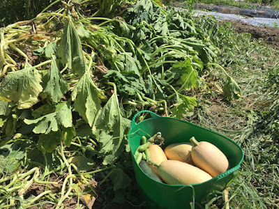 この3列の畝をデストロイヤー植え付けのための畝にするため、片付けていなかった両脇の2列のズッキーニを片付けた。