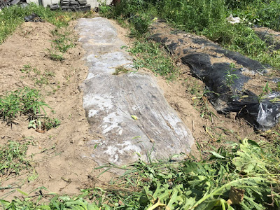 で、3畝のうちの1畝を早めに片付けて、太陽熱マルチとして透明マルチを掛けていた。