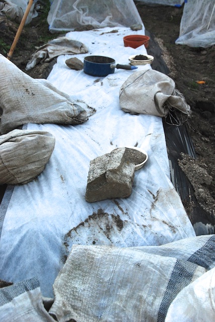 | 不織布が吹き飛ばないように、色々な重しでしっかり抑えていた。 あと1ヶ月は、霜よけ対策がいるだろう。 もう少し芽が伸びてきたら、不織布の掛け方は別の方法に切り替えよう。 |