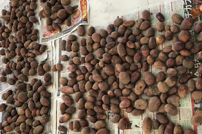 | こちらは新聞紙の上に広げているこの6月収穫の芋だが、毎日5個以上腐れている。 |