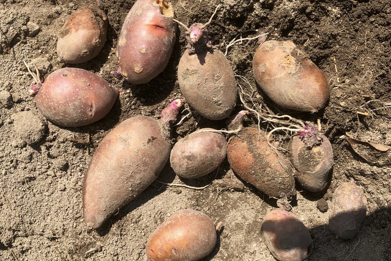 | 大きさは5cm前後にはなっていたが、とても食べる気が起こる芋はなかった。 同じ畝でのこの時期での2期作目の収穫は不可だった。 もちろん秋の初めに種芋を植えれば、冬の時期の収穫は問題なくできるだろう。 |