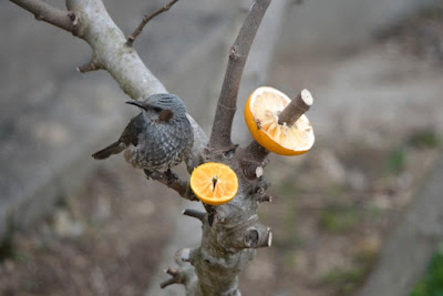 | こちらは先日から畑に遊びに来るようになったヒヨドリ。 今来ているのは、イチジクの上に置いたミカンのところだ。 完食されたミカンの側にまた小さなミカンを置いたらすぐ食べに来た。 |