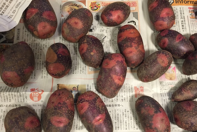 | こんなとき、「自分をデストロイヤー賞にノミネートしてくれ」 と、それぞれの芋が訴えてくるのだ。 ところで、この芋は春ジャガ?それとも夏ジャガ? |