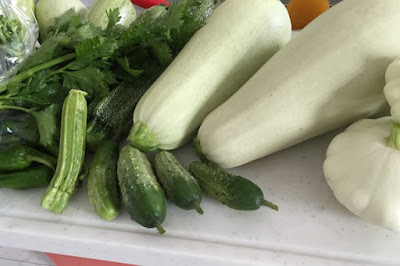 | 今日も収穫野菜はいっぱいだ。 ピクルス用のキュウリは、花ズッキーニの実とほとんど同じ長さだ。 |
