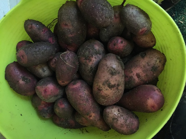 2日前は、冷蔵庫で、6〜8個づつ新聞紙に包んで保存していた種芋を植えていた場所の収穫だった。