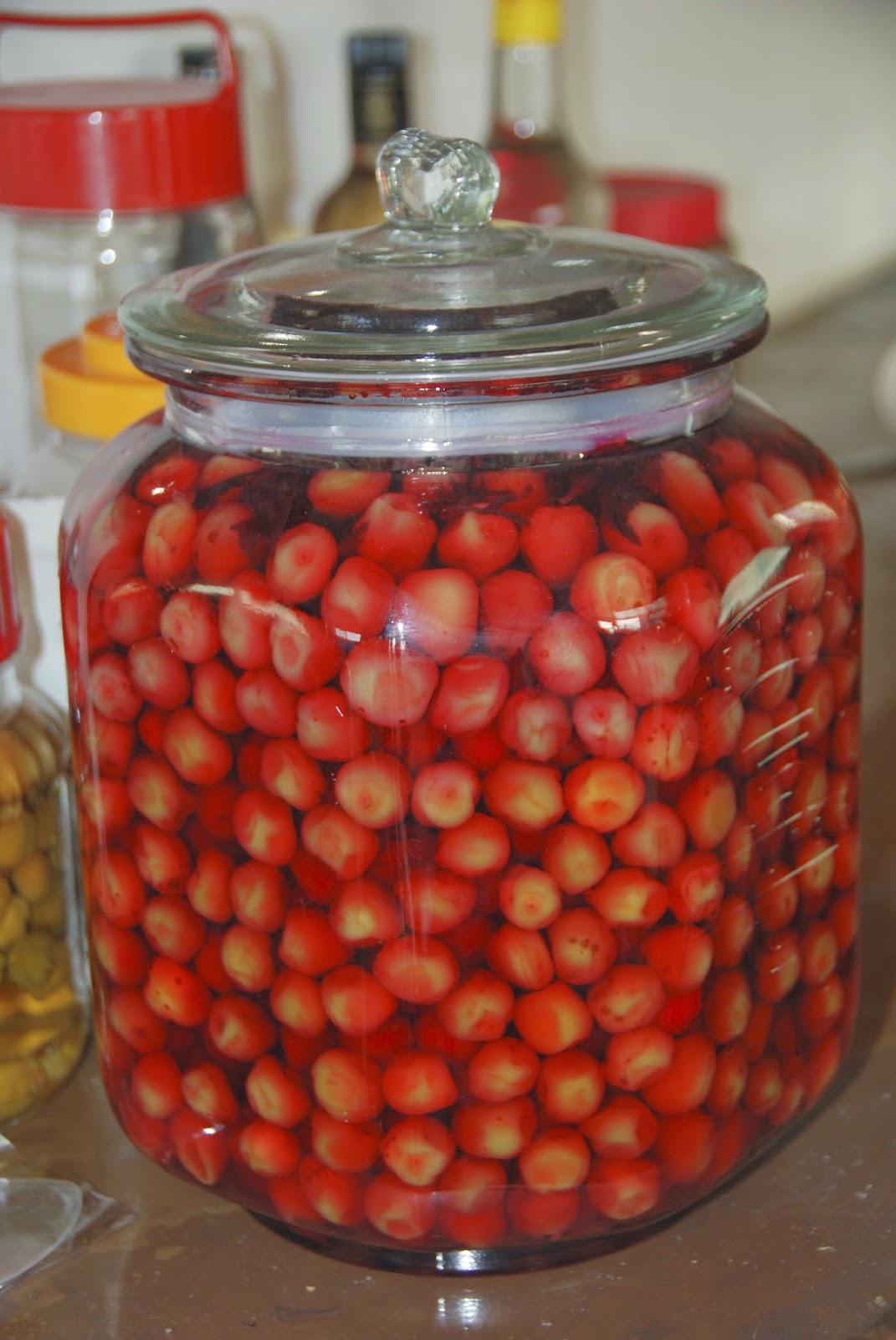 | 紫蘇は上に入れたのだが、梅酢は下から赤くなっていった。 実に面白い。 |