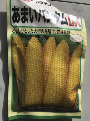 | トウモロコシに関しては、100円ショップの種よりこんな種の方がいい。 この一袋で、種の数は十二分あり、こちらの方が安く済むのだ。 |