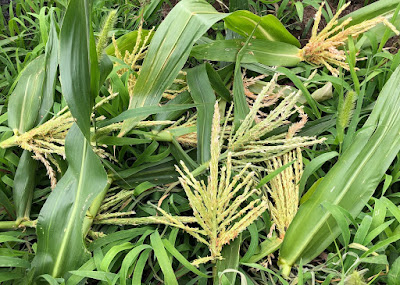 トウモロコシの畝の近くには、切られた雄しべが散らばっている。