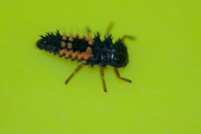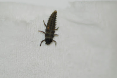 今日ディルの種を入れた容器で見つけたテントウムシの幼虫は十数匹いたので、虫かごにディルの花と一緒に入れていたのだが、3時間ほどして見てみたら、一部虫かごの隙間から外に出ていた。