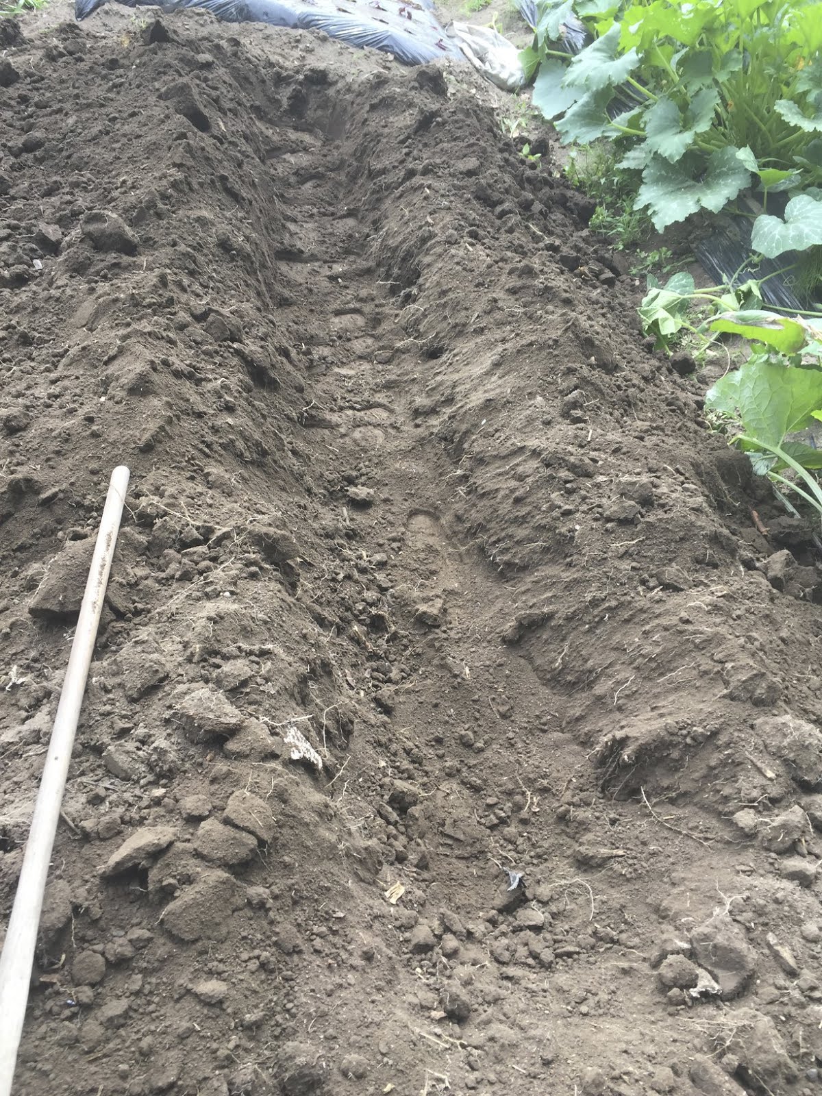 新しい畝はこんな状態だが、土の下に空気がいっぱいあるのは、次の野菜のためにいいのではないだろうか。