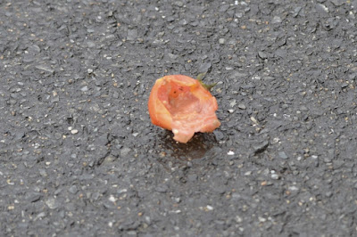 | カラスが電線の上に持って行って食べかすを落としている。 どうやら、甘いトマトの味を覚えてしまったみたいだ。 |