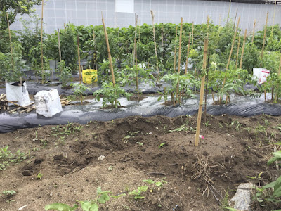 | ここはイタリアントマトの苗が余って、予定外で追加植えした畝。 ここに実を付け始めるのは7月の終わりころからだろうか? その頃には、トマトリッチな生活になりそうだ。 |