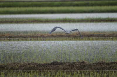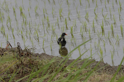 昨夕からしっかり降った雨で、我が菜園の前の田植えが終わった水田では、鳥たちが嬉しそう。