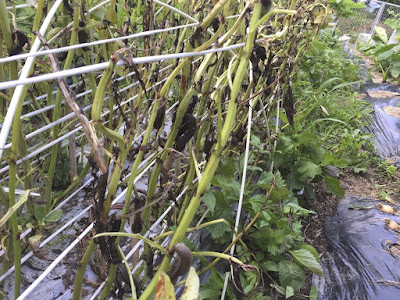 | こちらは、3日前山椒を植えた時の写真。 奥の風除けビニールあんどんを外した列から収穫が始まっている。 一番奥には、もう高さ1m近くに成長してきたヤーコンが緑の壁のように見える。 |