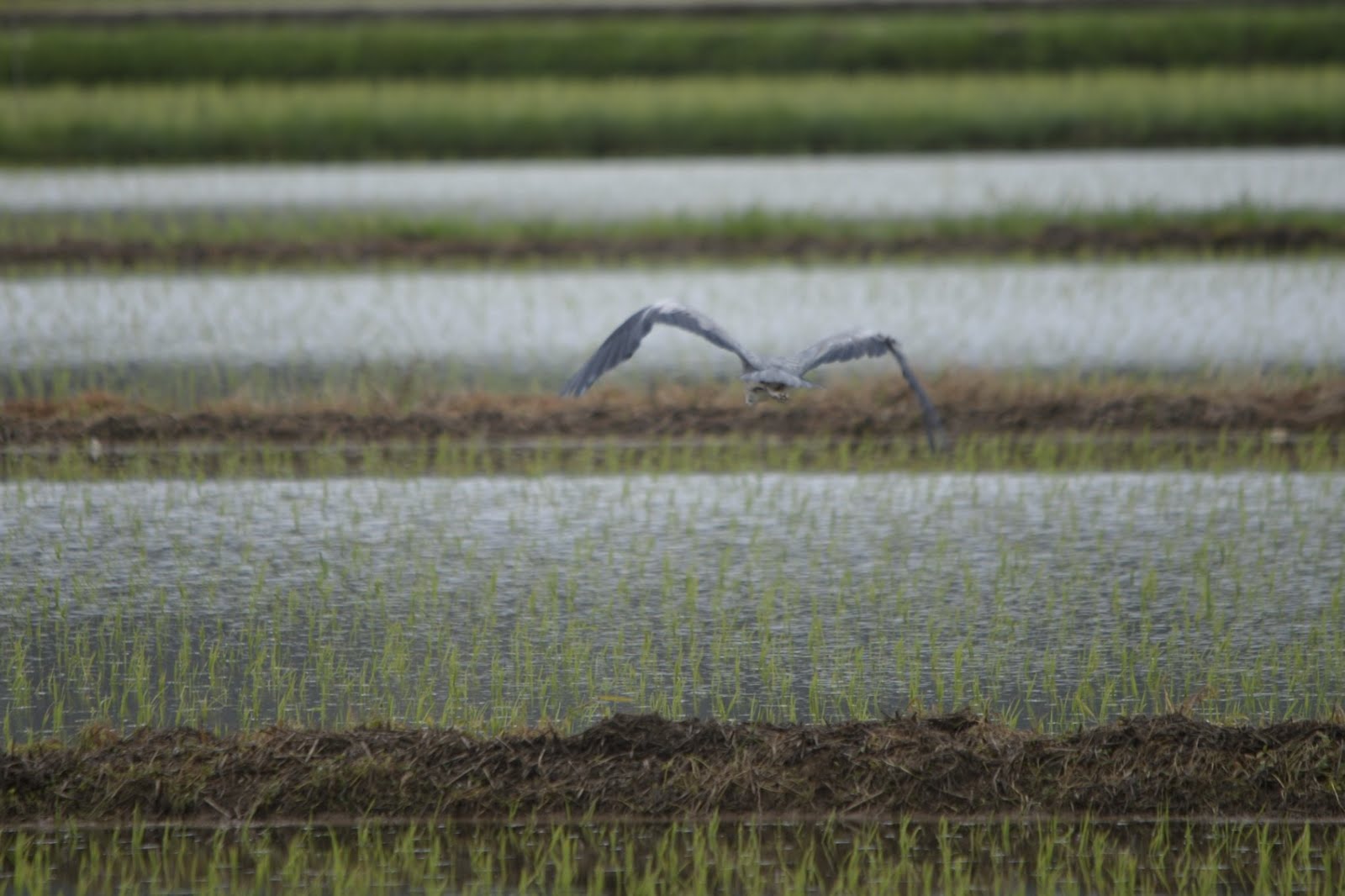 昨夕からしっかり降った雨で、我が菜園の前の田植えが終わった水田では、鳥たちが嬉しそう。