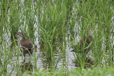 この時期の田んぼでは稲の苗が日々伸びて、バンの幼鳥は田んぼで遊んでいても目立たない。