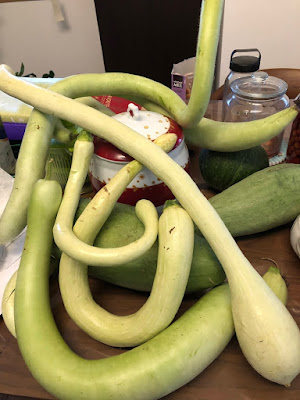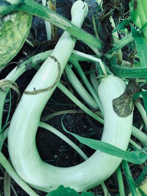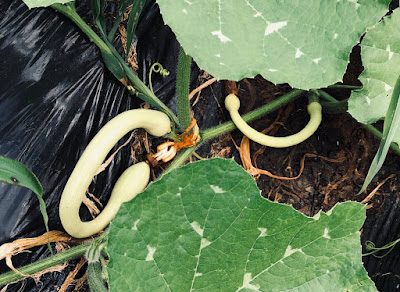 このトランペット型ズッキーニ、長いズッキーニと比べサイズ的には小さいのだが、最初の写真のような大きなものが採れ始めると区別が難しくなる。