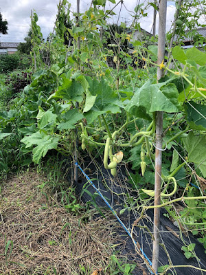 | この畝にはキュウリやゴーヤなどの蔓野菜をノリ網で育てている。 この畝にもトランペット型ズッキーニは進出してきている。 |