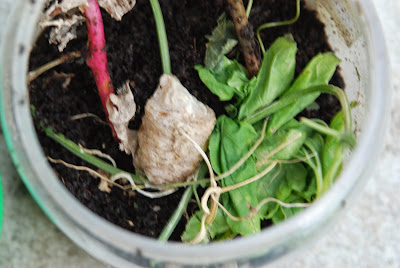 | 植え付けから3週間経っていたが根の張りは極めて悪かった。 茎の根元にはカビが付いていた。これが苗が弱った原因だったのだろうか? |