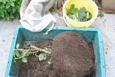 ナスの根に蛹が絡んでいることも考え、ラフに扱うと蛹が傷つく可能性があるので、まず茎ごと土嚢袋の土を広い容器に移した。