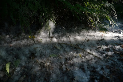 | 公園の中の道は大きな木々に囲まれて暗い。そんな道ばたに散らばっていた綿毛。 |