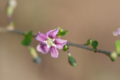 | 2年前の春に植えたクコが、紫色の小さな花を付けている。 花を付けたのは3回目だが、今年が一番花の数が多い。 実が成ったらお茶用に収穫しようと思っているのだが、今年は初収穫出来るだろうか? |