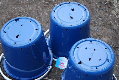 | 側面下部にあけた穴は問題なかったが、底にあけた穴のいくつかが割れ、大きな穴になった。 バケツの底にはもっとたくさんの穴を開けたかったのだが、 強度から考えてこれ以上の穴あけ作業は困難だ。 |