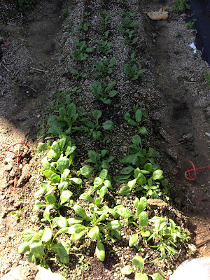 | 手前がベタがけしたところ。向こう側がそのままの露地栽培。 ベタがけしたところが明らかに育ちがいい。 |