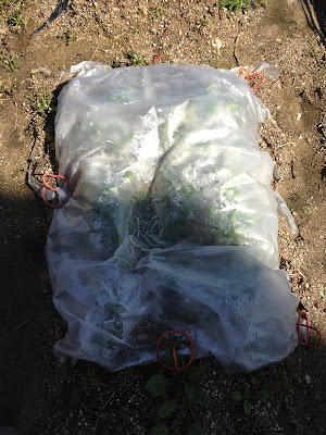 そこで、それらの小さな苗の一部にベタがけ(不織布ではなく半透明のゴミ袋で)やってみた(下の写真)。