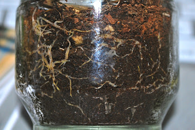 お〜ヒメミミズはいっぱい瓶の内側にくっついているが、シマミミズの赤ちゃんは1匹も居ない!