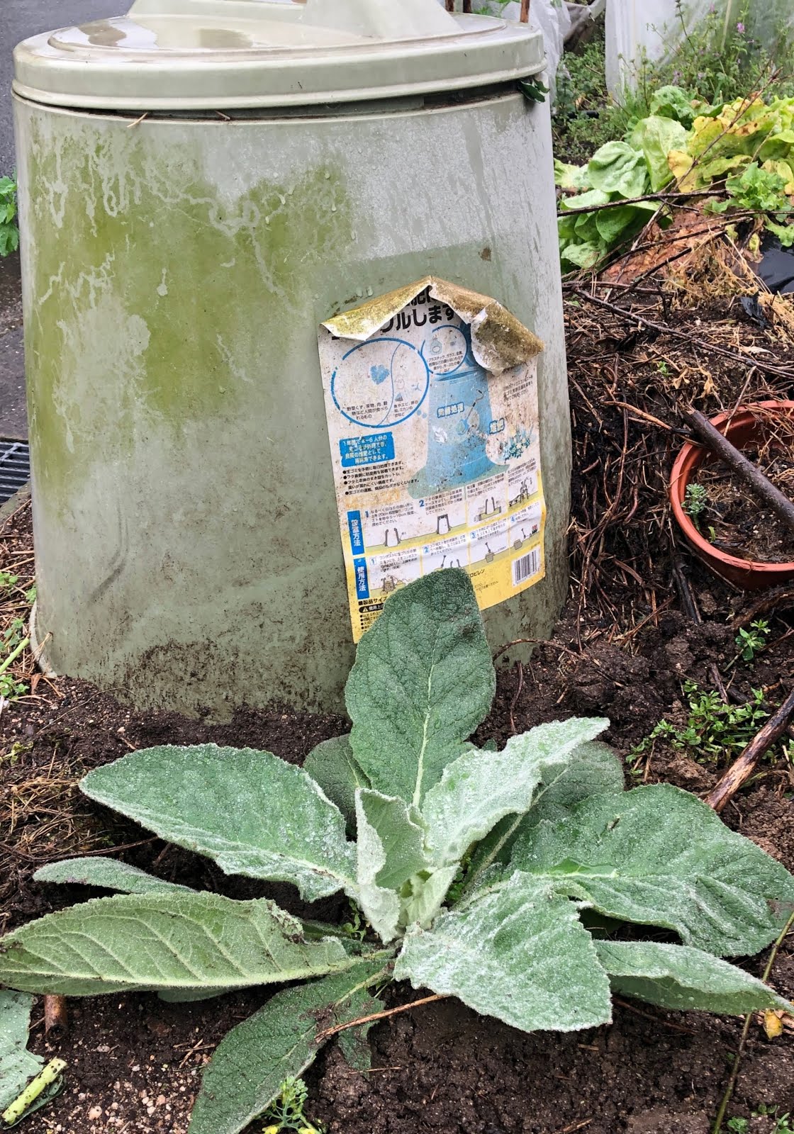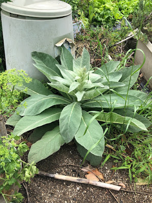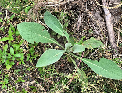 | こちらが、3月中旬に畑の隅に移植したときのビロードモウズイカ。 ここなら、高く成長しても、葉を広げても構わない。 |