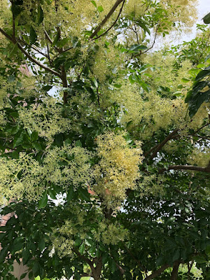 そしてバラの木の上には覆いかぶさるようにシマトネリコの花がいっぱい。