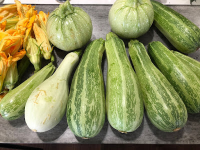 | うす緑の縞々タイプのズッキーニが丸型と共に今ピークを迎えている。 |