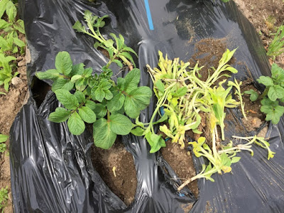 | こんなキクイモもそのまま置いておくと日当たりが悪くなり周囲の野菜のできが悪くなる。 そこで、目立つものから掘り返し、植え替えている 右の畝は最後に植えたジャガイモ。 |