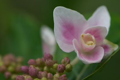 | 我が家の花壇の端の方に植えているアジサイ。 鉢植えで頂いたものが枯れかけて、植え直した。 まだ小さいが、毎年かわいい花を見せてくれる。 |